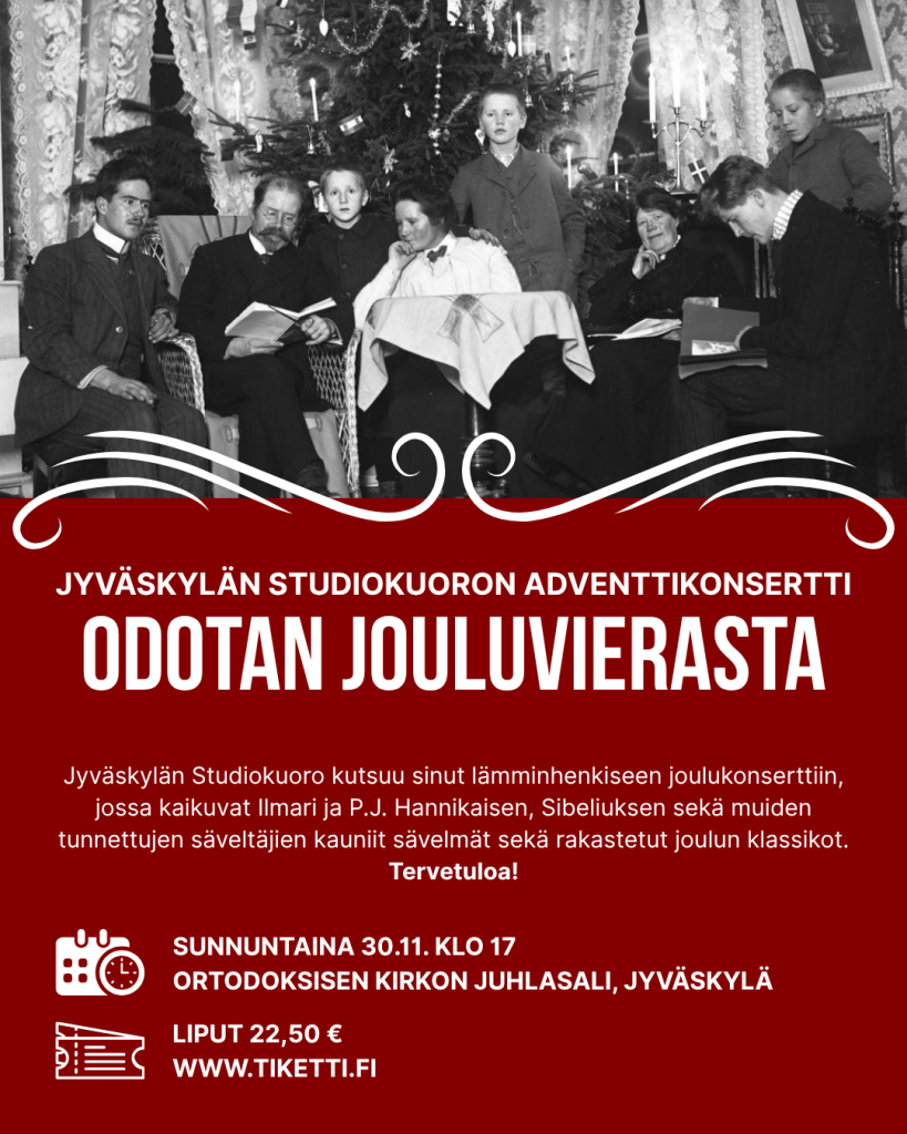 Jyväskylän Studiokuoro kutsuu sinut lämminhenkiseen joulukonserttiin, jossa kaikuvat Ilmari ja P.J. Hannikaisen sekä muiden tunnettujen säveltäjien kauniit sävelmät sekä rakastetut joulun klassikot. Luvassa on Jyväskylän musiikkihistoriaan tukeutuva perinteinen, kavalkadi joulun odotuksen tunnelmaa. Kuoroamme johtaa musiikkineuvos Hannu Ikonen.